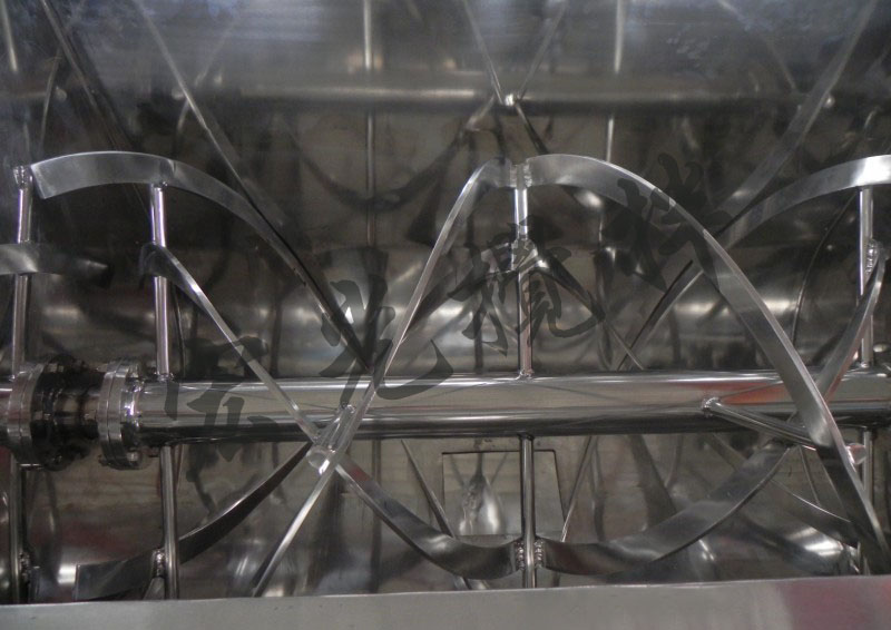 臥式螺帶混合機(jī)由U形容器、螺條攪拌葉片和傳動部件組成;螺條狀葉片一般做成雙層或三層,外層螺條將物料從兩側(cè)向中央?yún)R集,內(nèi)層螺條將物料從中央向兩側(cè)輸送,形成對流混合。螺條混合機(jī)對于粘性或有凝聚性的粉粒體的混合以及粉粒體中添加液體及糊狀物料的混合有良好的效果,筒蓋可做成全開式門,以便于對設(shè)備進(jìn)行清洗替換產(chǎn)品。